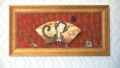 扇型の木製プレートに電動糸鋸で切り出したパーツを貼り付けレリーフ加工し、水彩ステインで色のベースを作りアクリル絵の具で部分的に彩色しました。