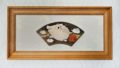 扇型の木製プレートに電動糸鋸で切り出したパーツを貼り付けレリーフ加工し、水彩ステインで色のベースを作りアクリル絵の具で部分的に彩色しました。