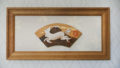 扇型の木製プレートに電動糸鋸で切り出したパーツを貼り付けレリーフ加工し、水彩ステインで色のベースを作りアクリル絵の具で部分的に彩色しました。
