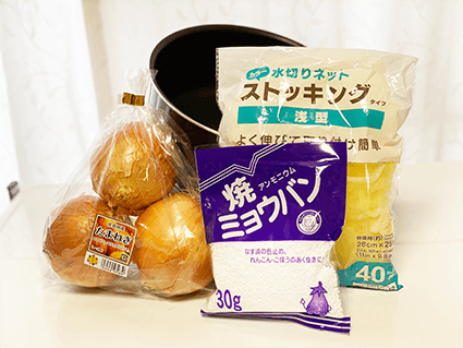 A玉ねぎの皮は3個分使いました。B紫陽花の葉はわさっと(それぞれネットに入れて口を縛ってます)