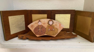 作品は扇型のプレートに水性のステインで彩色したレリーフ仕上げの小さな雛飾りです